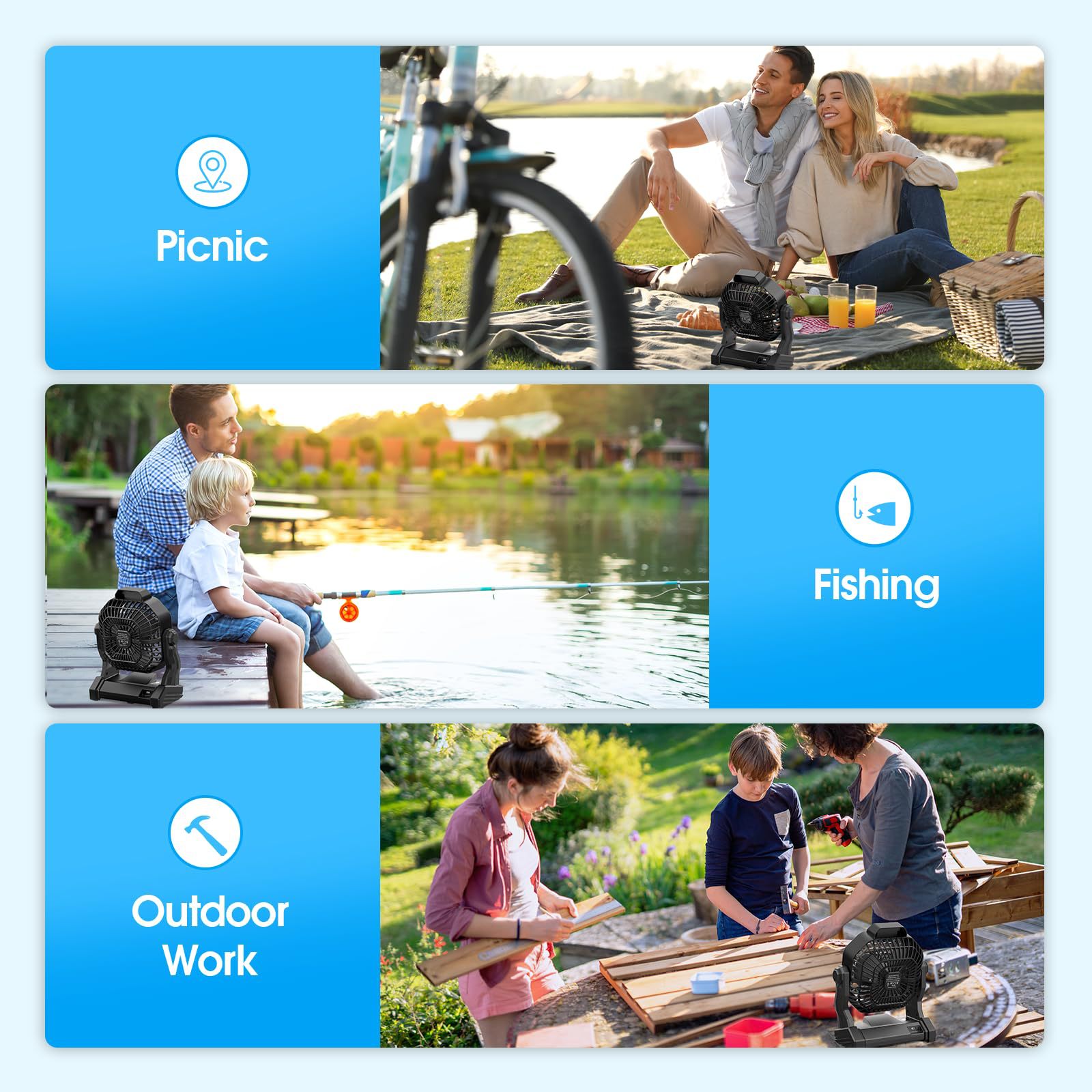 🌞【10400mAh Capacity Battery】- High capacity battery fan built-in a 10400mAh rechargeable battery offers continuous coolness for up to 8-36 hours, allowing you to enjoy fishing, camping, and picnics all day long. It also supports a 7W solar panel charging that effectively captures sunlight and converts it into energy, allowing you to enjoy uninterrupted airflow wherever you go!